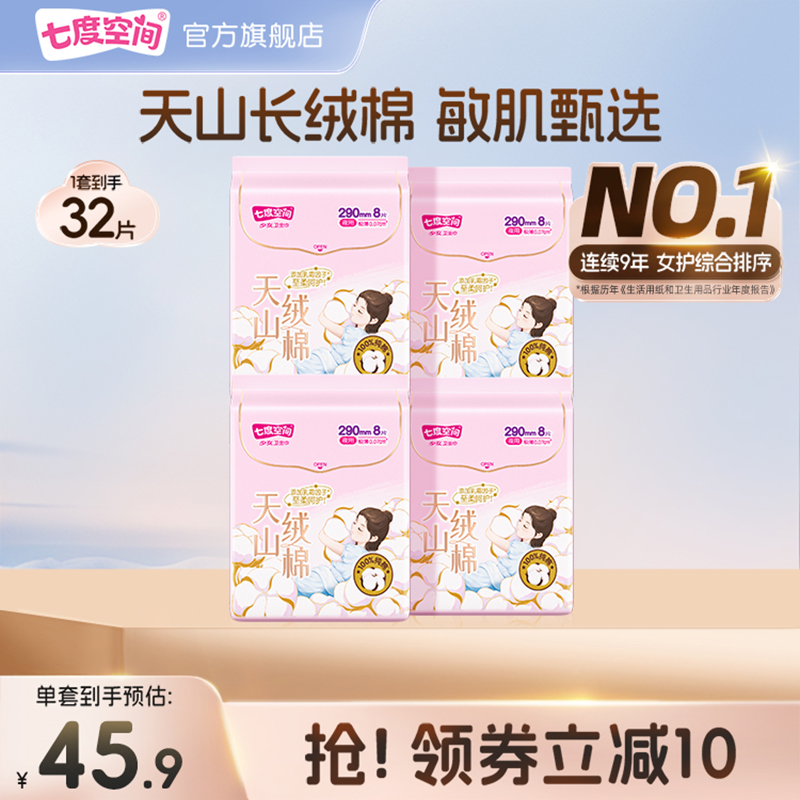 【新国标认证】七度空间少女纯棉超薄干爽超长夜用卫生巾338mm