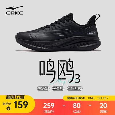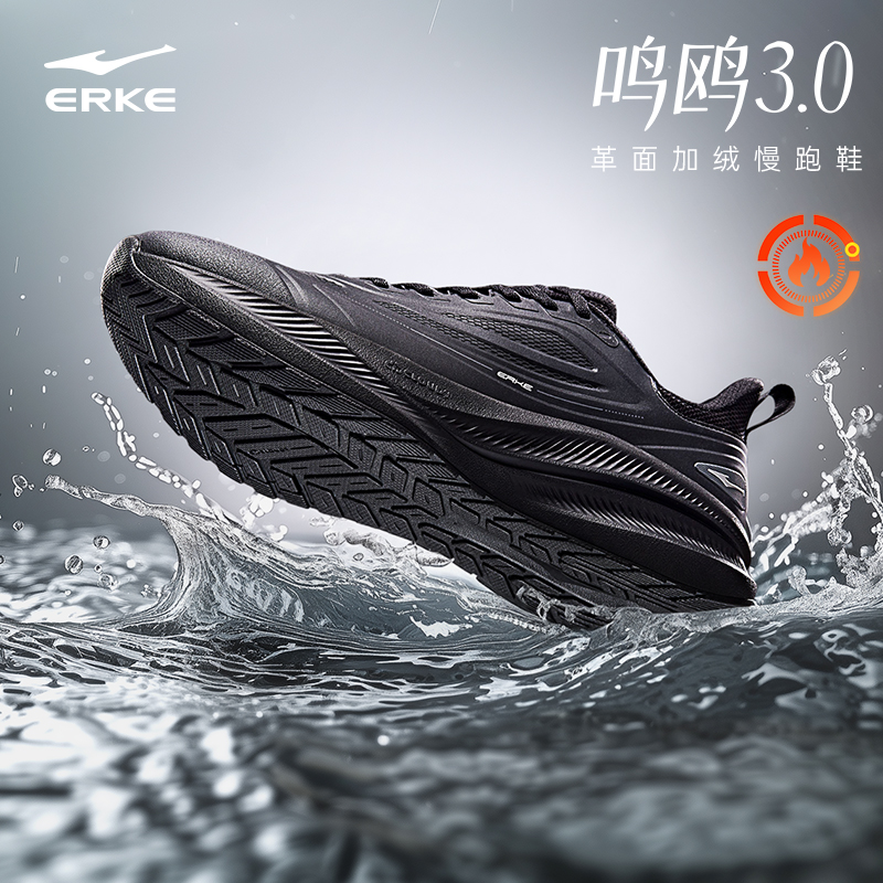 鸿星尔克青少年运动鞋冬新款加绒跑步鞋皮面防水跑鞋黑色棉鞋男鞋