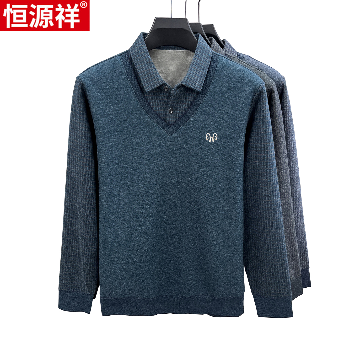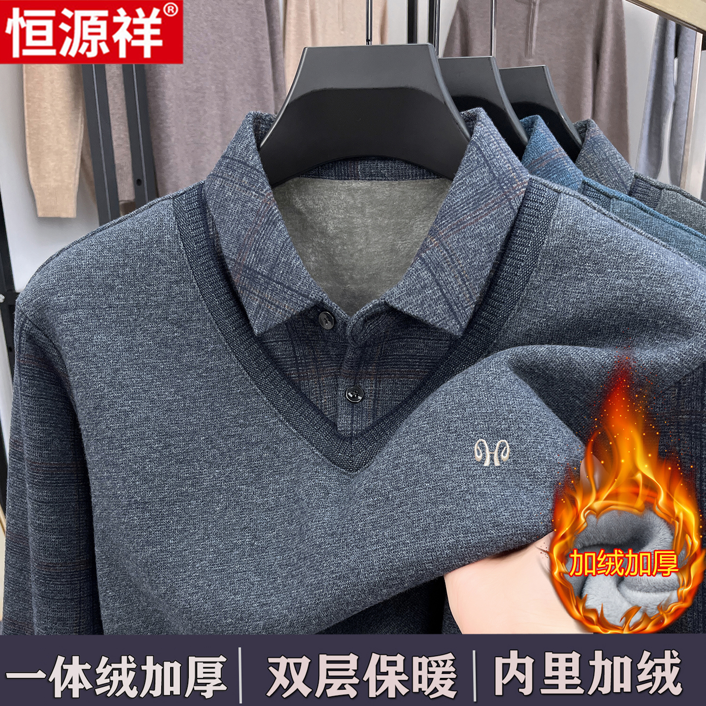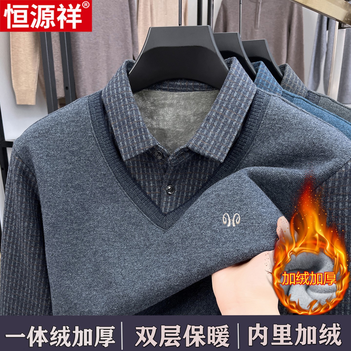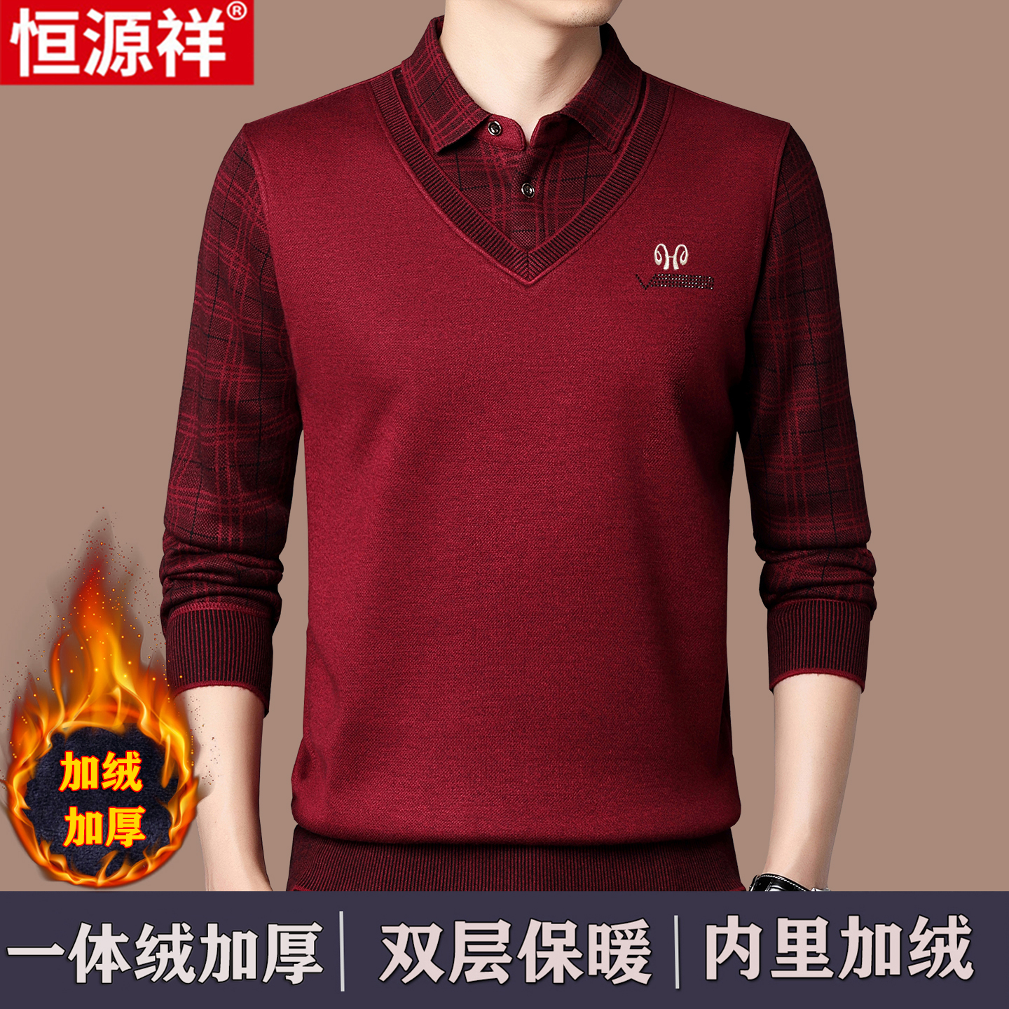 恒源祥一体绒羊毛衫男毛衣冬季中年假两件加绒加厚保暖爸爸打底衫
