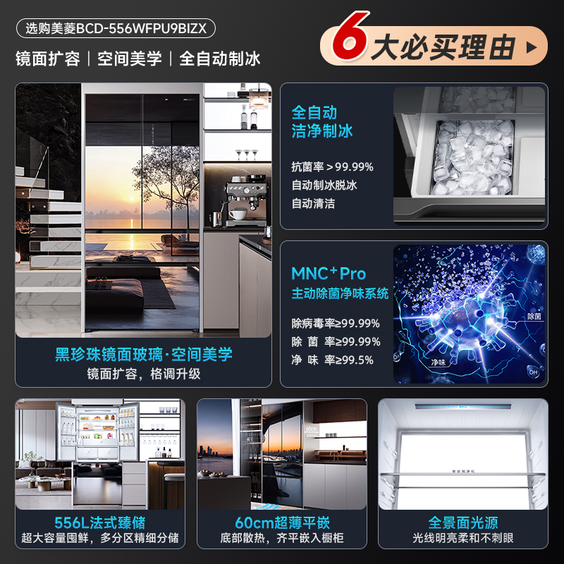 美菱黑珍珠556L镜面零嵌超薄法式多门制冰冰箱一级家用以旧换新