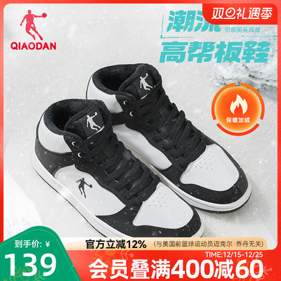 乔丹黑白薄底学生高帮加绒板鞋秋冬新款棉鞋运动鞋皮面保暖休闲男