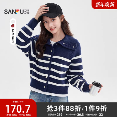三福开衫毛衣2025新款冬季休闲宽松大翻领条纹外套上衣女装512192