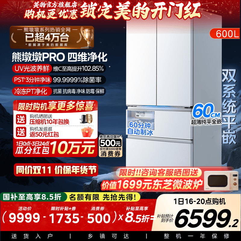 美的熊墩墩PRO超净600L冰箱超薄零嵌入式双系统法式多门双开家用