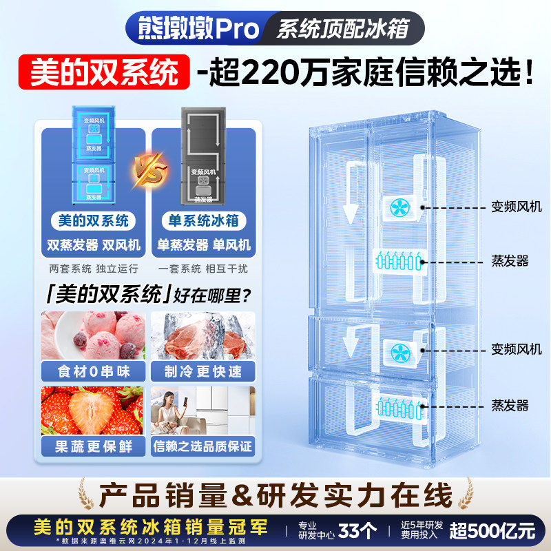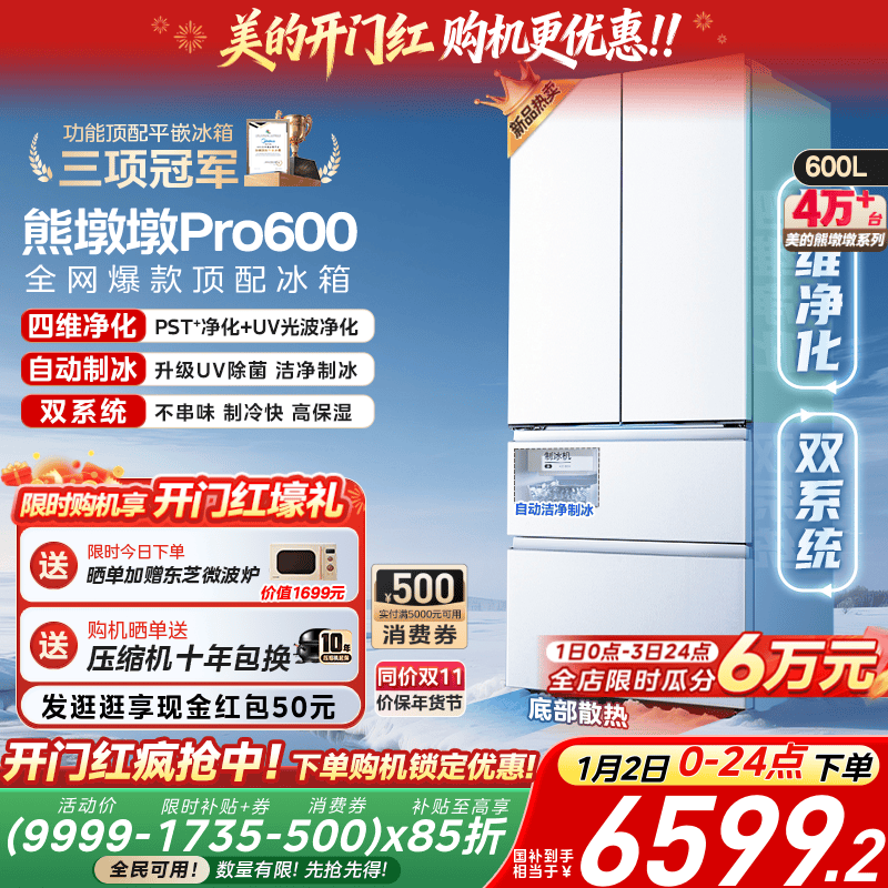 【洁净制冰】美的熊墩墩Pro600双系统零嵌超薄冰箱法式双开门家用