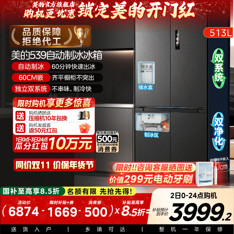 政府换新补贴美的M60cm超薄539零嵌入式冰箱制冰家用十字双开四门