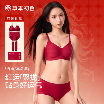 草本初色内衣套装本命年女红色结婚马年小胸聚拢无钢圈收副乳文胸