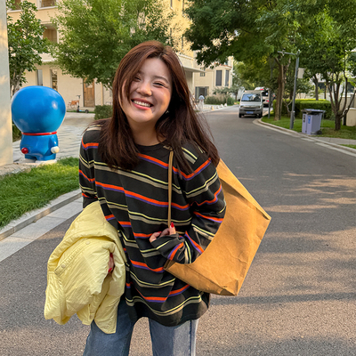 胖mm秋冬休闲彩色条纹针织衫木子理想大码女装显瘦百搭T恤200斤