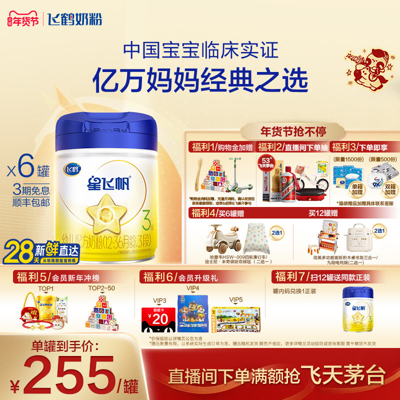 【官方正品】飞鹤星飞帆3段婴幼儿配方牛奶粉900g*6罐5HMO专利OPO