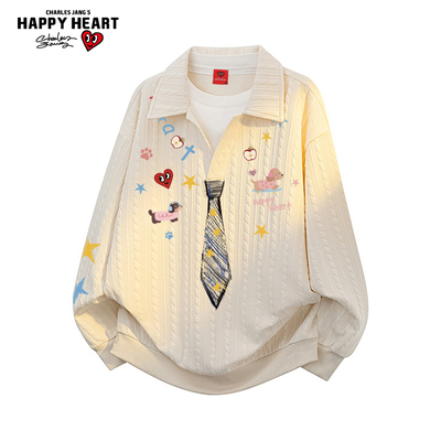 查尔斯桃心加绒涂鸦领带假两件衬衫领卫衣男女秋冬季情侣休闲衣服