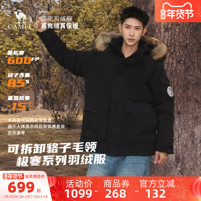 骆驼男装毛领工装派克羽绒服防水外套冬季男户外新款黑色鸭绒加厚