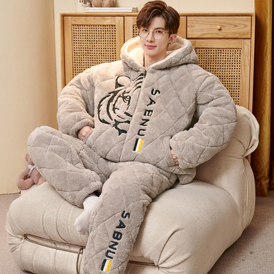 珊瑚绒睡衣男士冬季三层夹棉加厚加绒青少年男款保暖秋冬天家居服