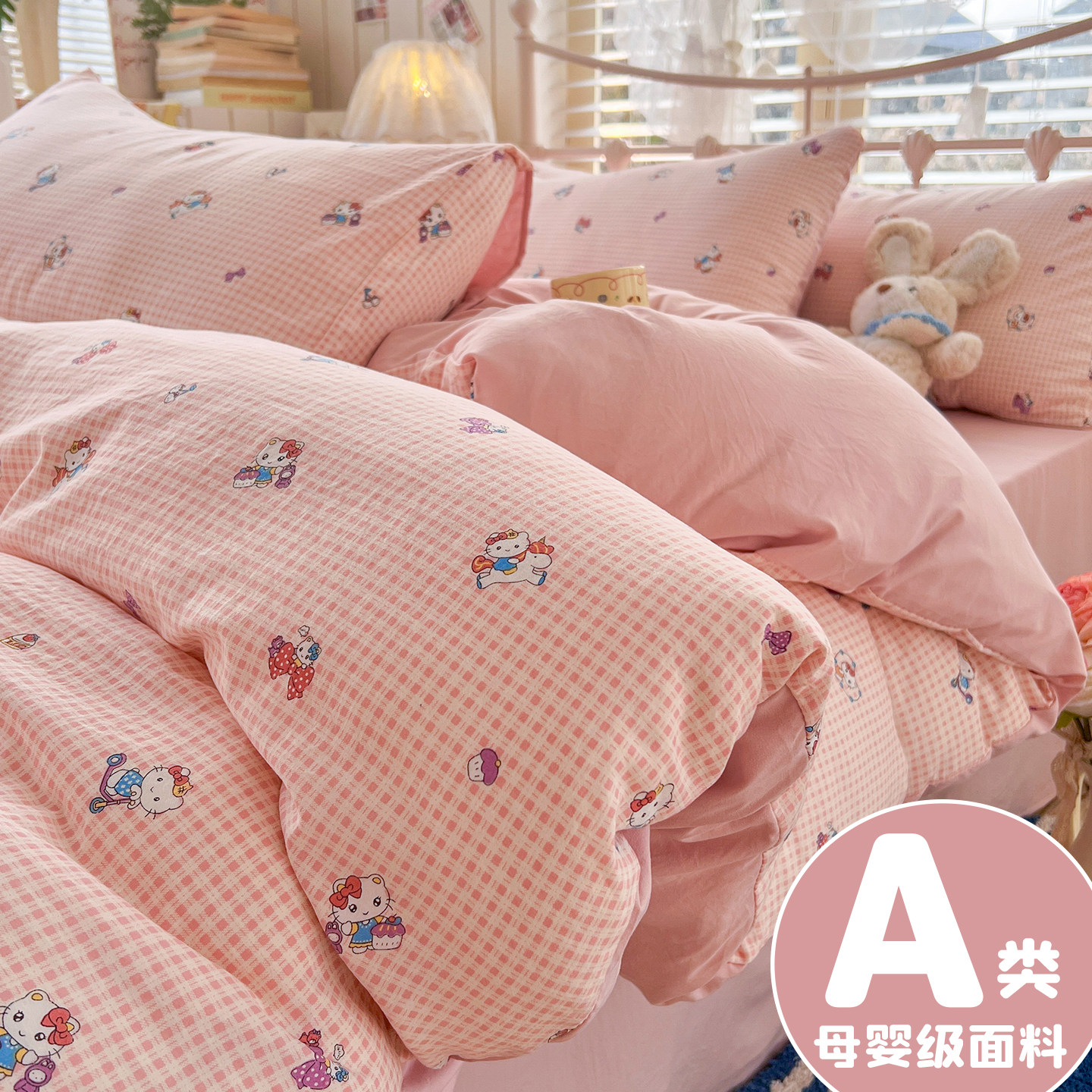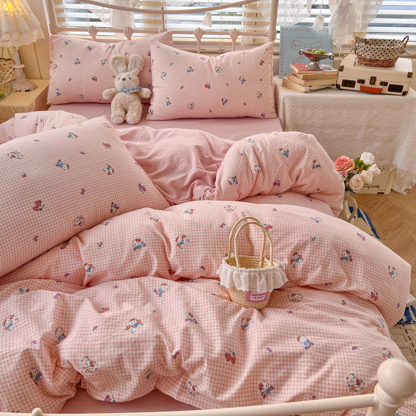 ins风kt猫咪水洗棉全棉四件套少女纯棉床单被套学生宿舍三件套1.5