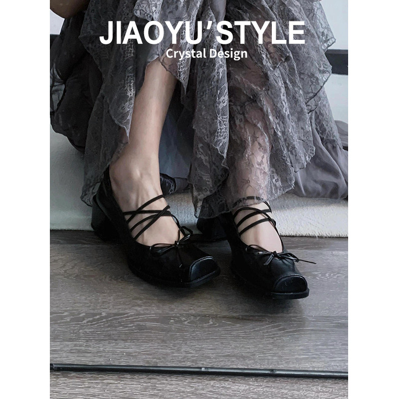 真皮~骄屿法式绝美蝴蝶结复古玛丽珍浅口方头单鞋女不累脚高跟鞋