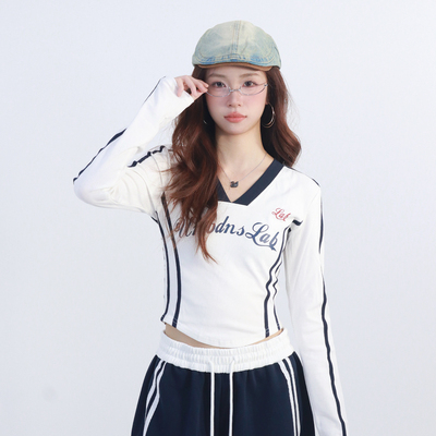 大佬街舞潮牌美式撞色V领长袖t恤jazz辣妹印花球衣修身上衣23400