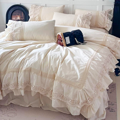 法式奶油风全棉水洗棉四件套镂空蕾丝边被套床单床裙公主纯棉床品