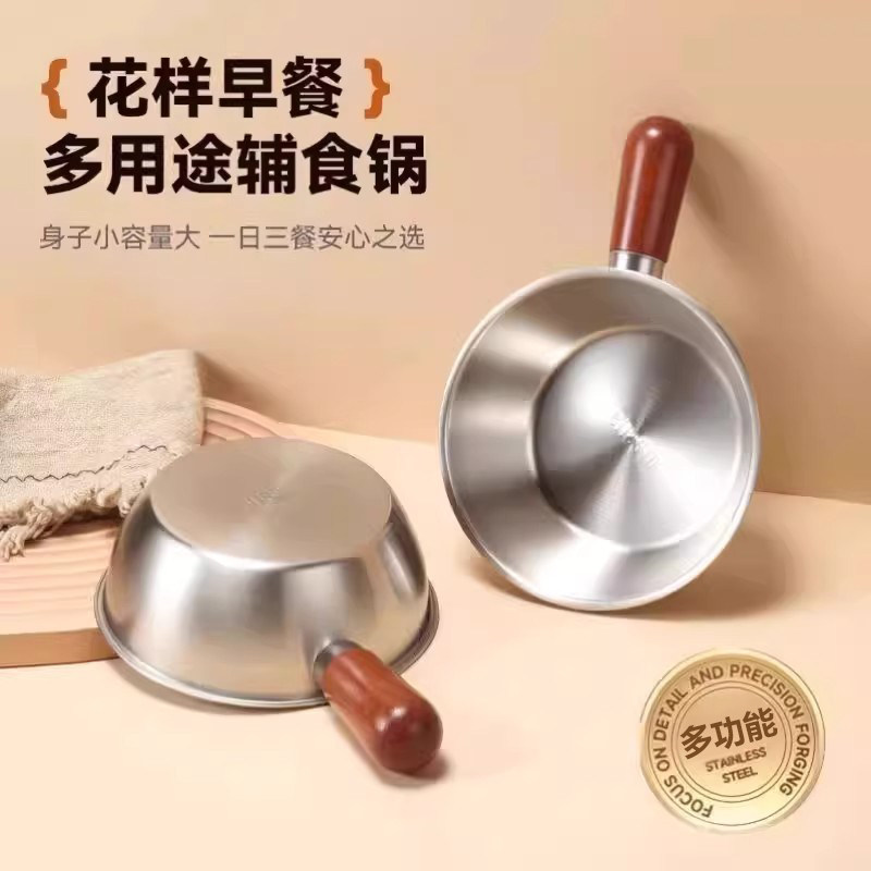 不锈钢胡桃木手柄平底锅宝宝辅食锅热油锅多功能汤锅炒菜锅