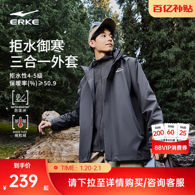 鸿星尔克加厚外套男款冬季新款男士冲锋运动风衣三合一羽绒服爸爸