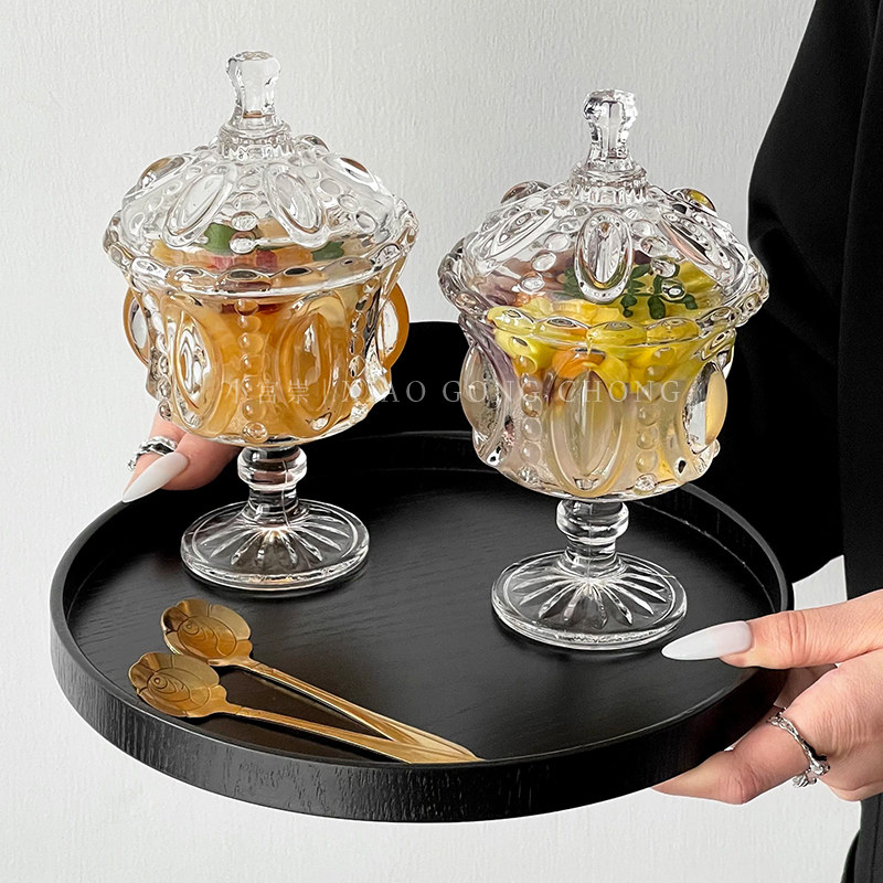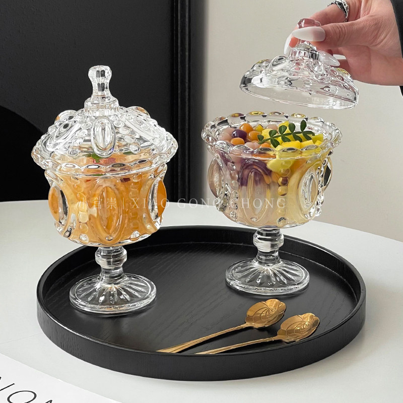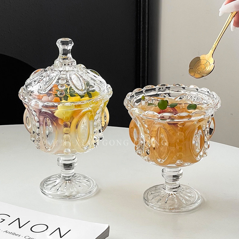 小众中古带盖甜品碗宫廷风浮雕冰淇淋杯玻璃杯高颜值糖水碗酸奶碗