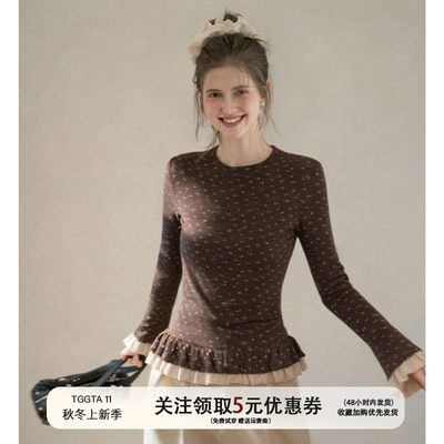 TGGTA11咖色花边碎花磨毛长袖t恤女秋冬正肩内搭打底衫喇叭袖上衣