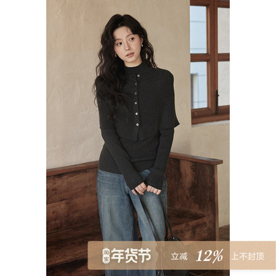 夕蒙2025新款冬季韩系针织衫设计感上高级感深灰毛衣披肩两件套女