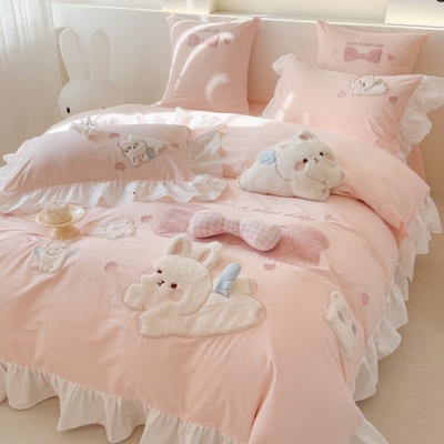 少女心可爱兔子全棉水洗棉四件套卡通刺绣公主风纯棉床单被套床品