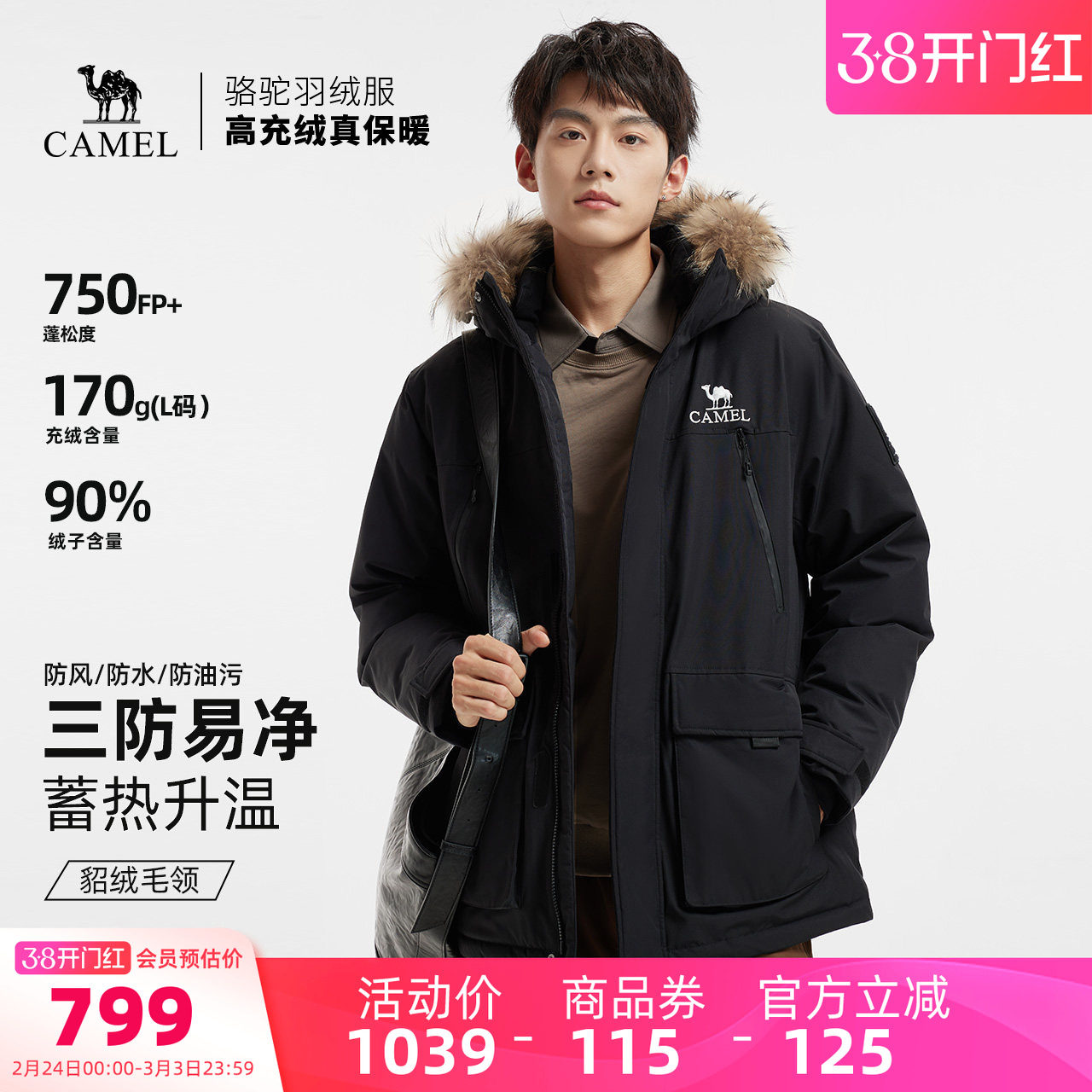 骆驼男装羽绒服黑色防水短款鸭绒冬季保暖面包服户外派克工装毛领