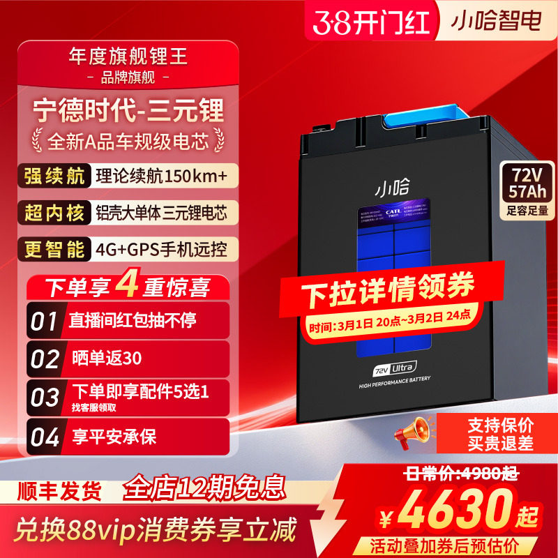 小哈电动车锂电池72V57AH三元锂电池外卖骑手大容量电瓶车电池