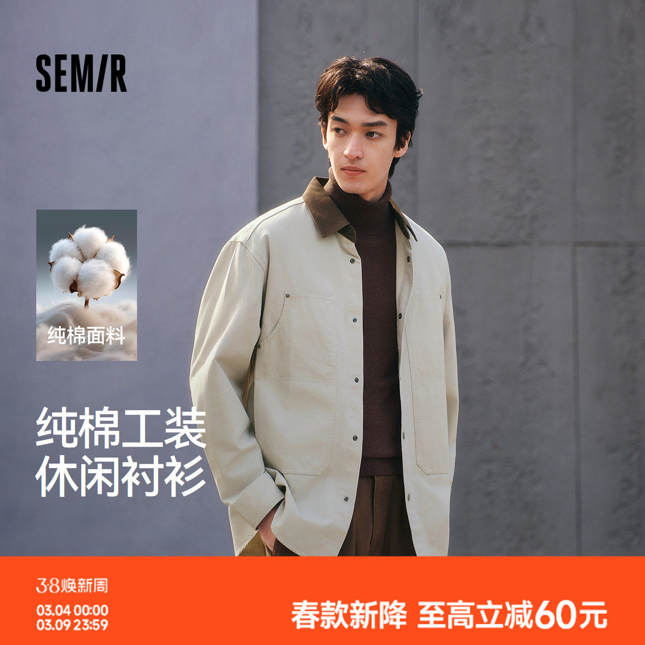 撞色宽松翻领外套 纯棉工装口袋长袖衬衫