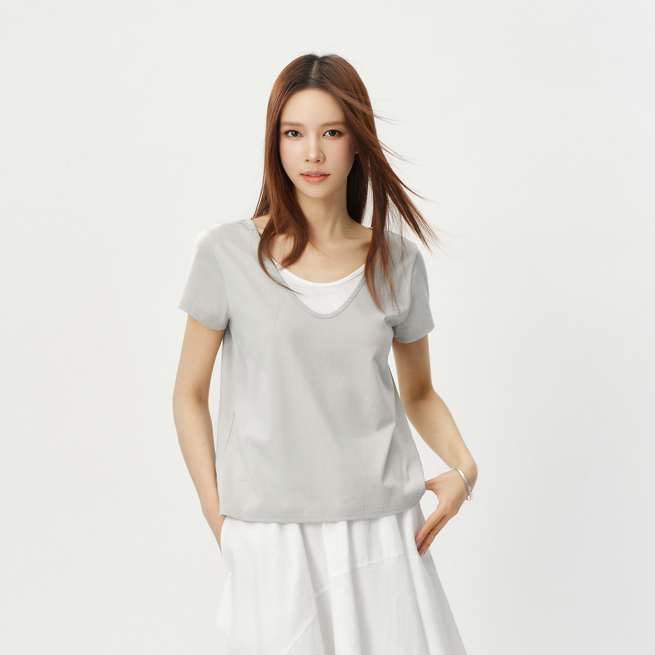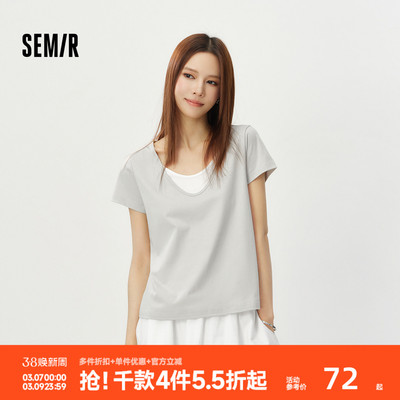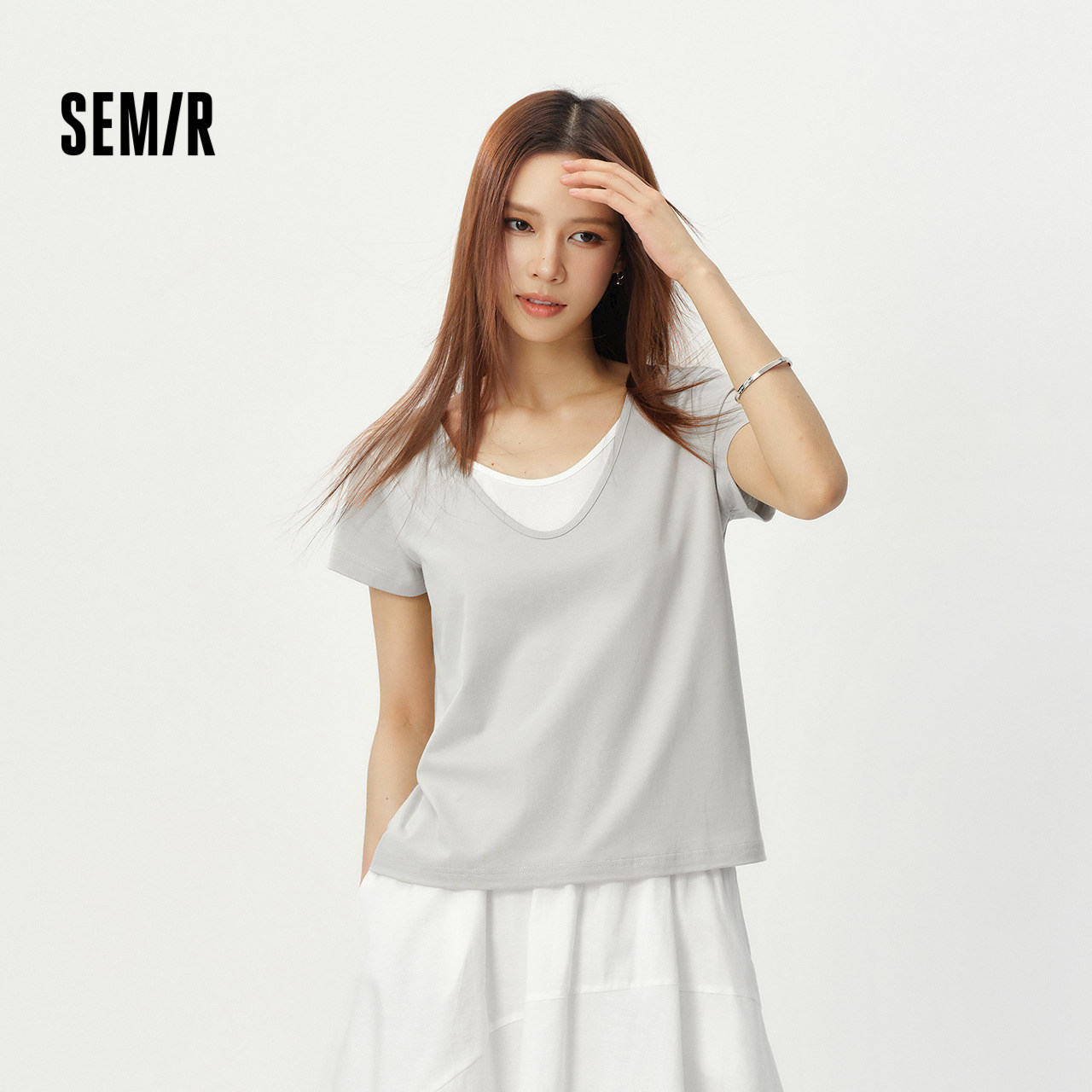 拼色U领穿出叠穿效果 时尚假两件