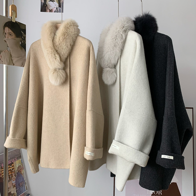 韩国东大门狐狸毛领围巾双面羊毛呢子大衣斗篷外套女阔版冬季新款